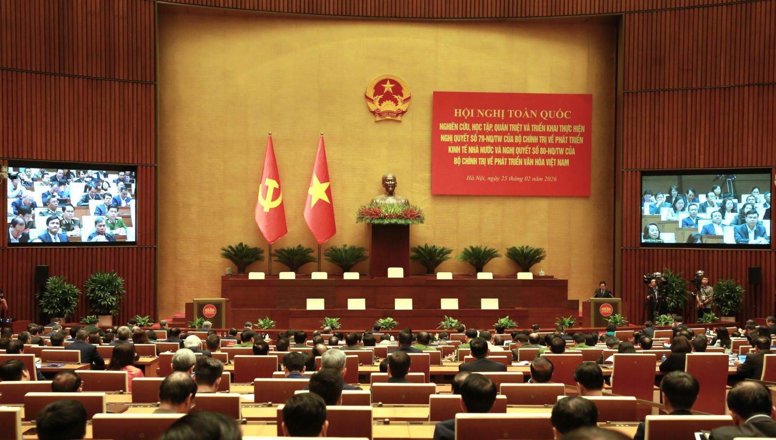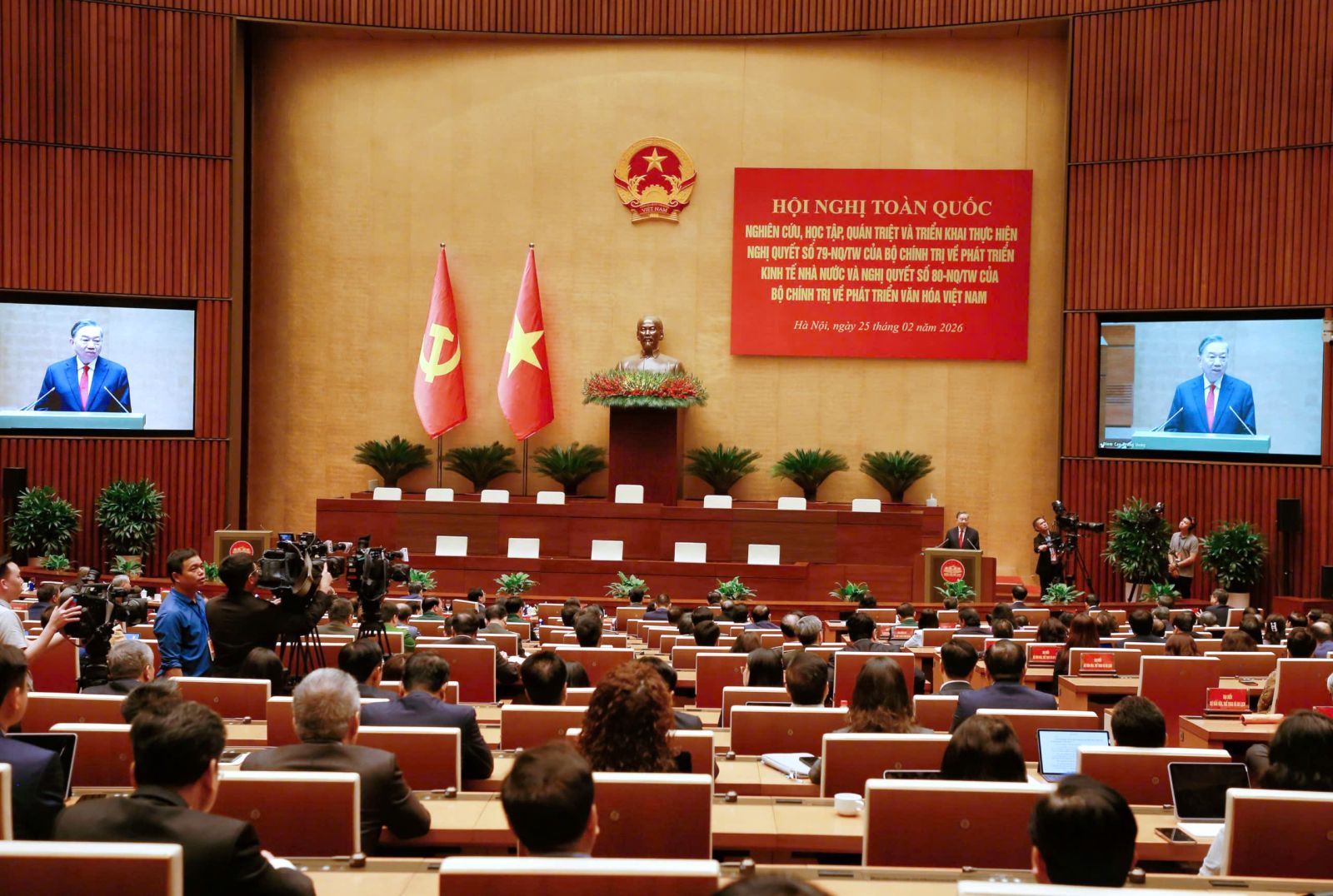 (TGDV) - Sáng 25/2/2026, tại Hội trường Diên Hồng, Nhà Quốc hội, Ban Bí thư tổ chức Hội nghị toàn quốc nghiên cứu, học tập, quán triệt và triển khai thực hiện Nghị quyết số 79-NQ/TW về phát triển kinh tế Nhà nước và Nghị quyết số 80-NQ/TW về phát triển văn hóa Việt Nam của Bộ Chính trị. Tổng Bí thư Tô Lâm dự và phát biểu chỉ đạo Hội nghị.